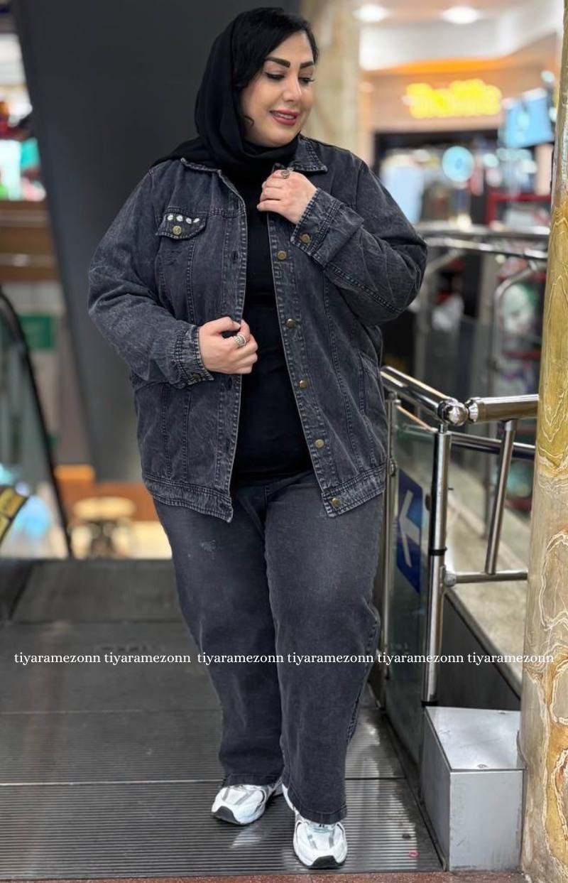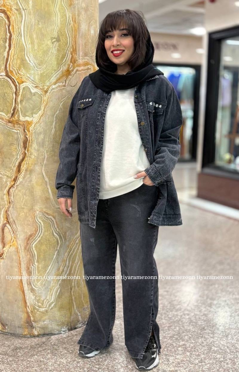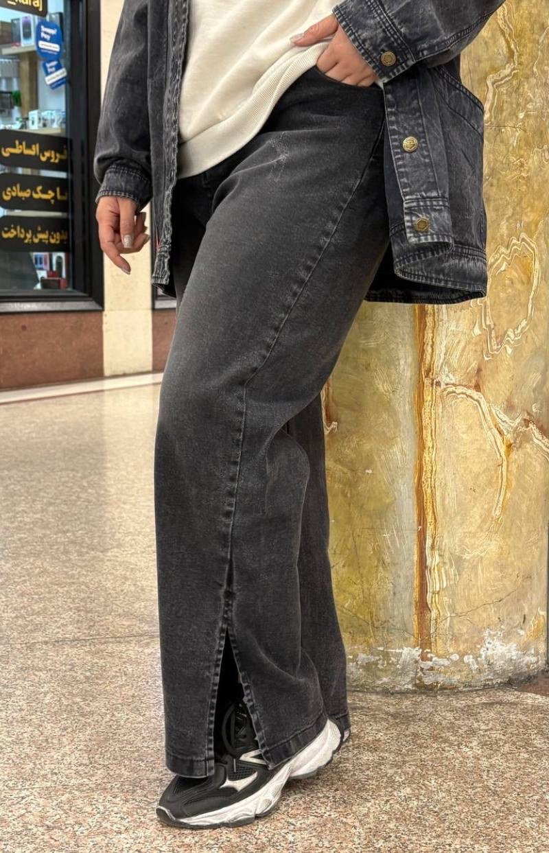 شلوار جین راسته سایزبزرگ مدل بغل چاک ذغالی کد 395